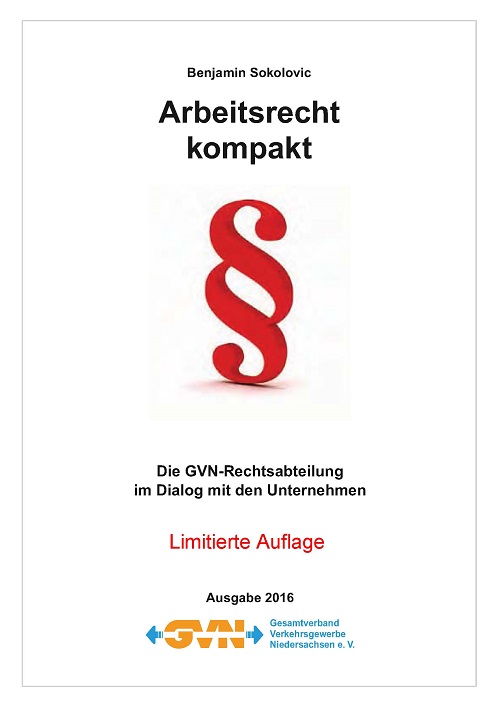 Das neue Buch „Arbeitsrecht kompakt“ ist ab sofort erhältlich. Interessierte Mitglieder können es bei der GVN-Rechtsabteilung telefonisch unter 0511 9626-210 oder per E-Mail robinson@gvn.de kostenlos anfordern oder nachfolgend downloaden.