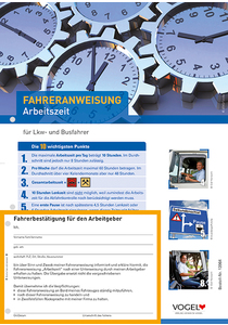 Die Fahreranweisung im DIN A4-Format, die auf 8 Seiten das Wichtigste zum Thema zusammenfasst, eignet sich optimal als Grundlage der Einweisung. Mit der abtrennbaren Bestätigung kann die Beauftragung und Unterweisung für den Arbeitgeber bestätigt werden. Außerdem werden auf dem Deckblatt die 10 wichtigsten Punkte zur Arbeitszeit für den Fahrer noch einmal zusammengefasst.