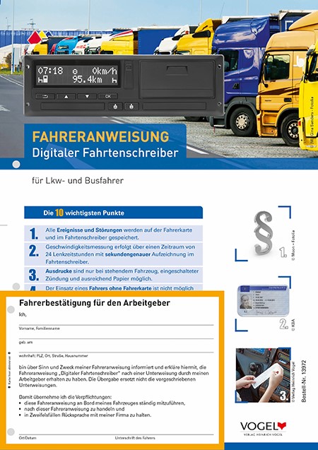 Die neu eingeführte Pflicht zur „Eingabe Land“ bei der ersten Haltemöglichkeit ist ein typischer Fall, wo Unternehmen im Güter- und Personenverkehr ihre Mitarbeiter (nach-) schulen müssen. Die Fahreranweisung unterstützt sie dabei effektiv. Anschauliche, kompakt gehaltene Erläuterungen und praxisrelevante Abbildungen geben Sicherheit bei den rechtlichen Zusammenhängen. Und sie zeigen Lkw- und Busfahrern die Bedienung der Digitalen Fahrtenschreiber. Wichtige manuelle Eingaben können Schritt für Schritt nachvollzogen werden.